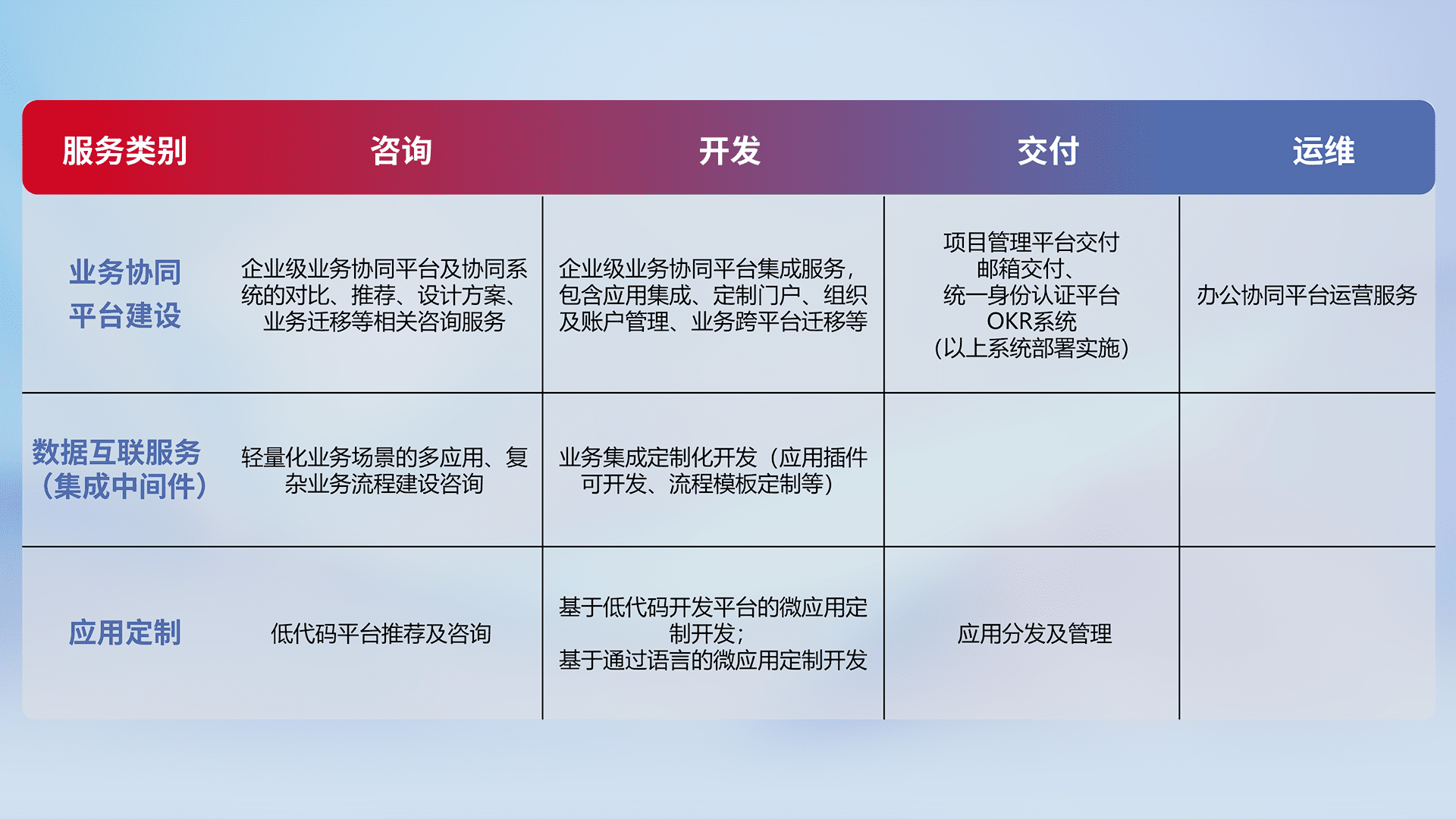 针对钉钉、、、、企微、、、、IDaas等平台级产品提供产品的规划、、、、方案、、、、交付、、、、定制化开发等服务,,,实现如统一协同办公、、智能客户服务、、、、混合会议管理、、智能数据查询、、、等业务场景,,实现数字化转型。。。