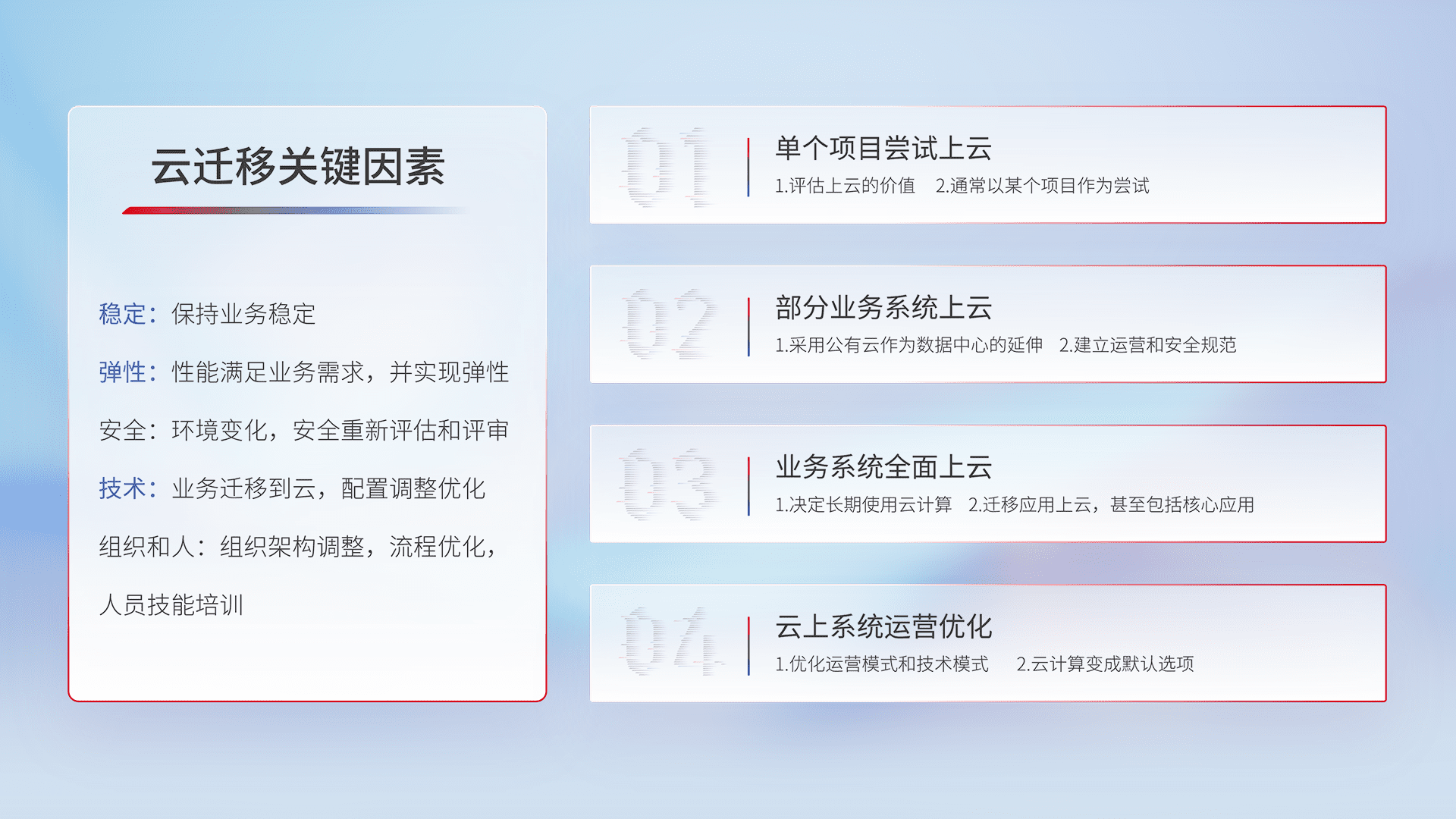 结合实际业务,,,,从规划设计、、、、云平台选型、、、云原生改造、、、数据迁移、、集成交付,,,迁移全过程为客户识别最佳上云路径,,,,做好风险识别管理,,设计网络架构、、、身份权限、、安全审计合规、、、操作审计、、、日志审计、、监控告警策略、、、多站点容灾设计等,,对云上基础设施进行整体规划,,,提升IT治理水平,,,以满足弹性、、高可用、、、、高性能的需求。。。