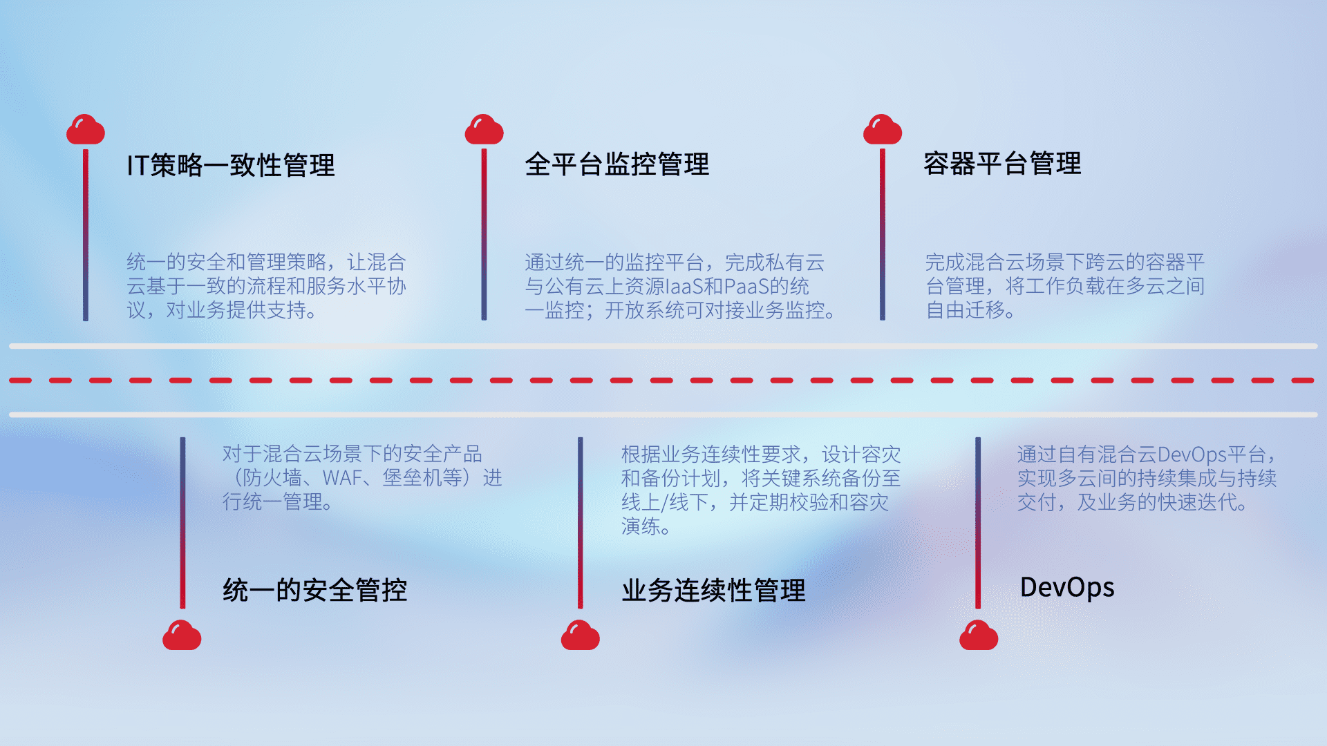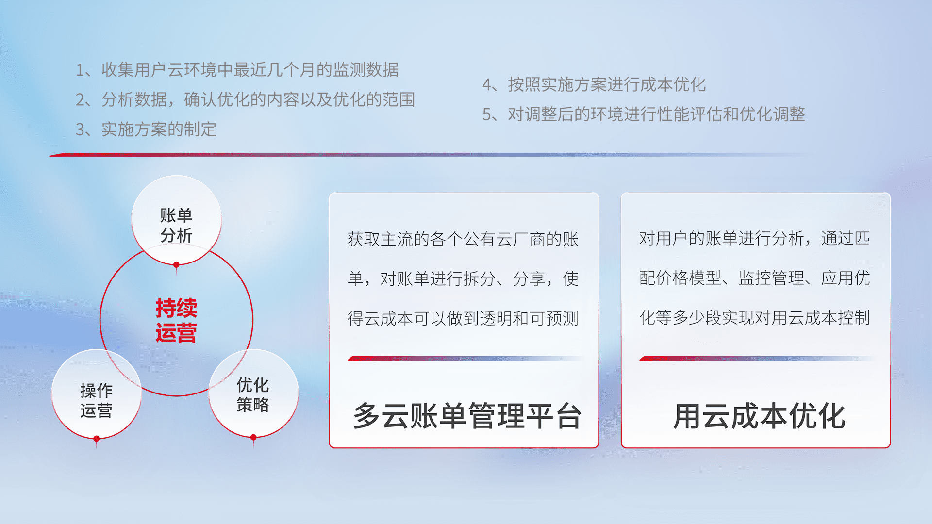 通过多云纳管,,以统一的资源数据模型把客户的云资源进行抽象和封装,,进而实现对多云资源的统一操作,,,保障云资源管理的可靠性、、稳定性与可用性。。。量身定制化运维内容,,配置、、开发运维、、、、补丁管理、、、、备份、、、、监控、、、认证和访问管理、、、、审计和日常巡检等,,,,保障在用云过程中的可靠度,,,稳定度以及高可用率。。。。