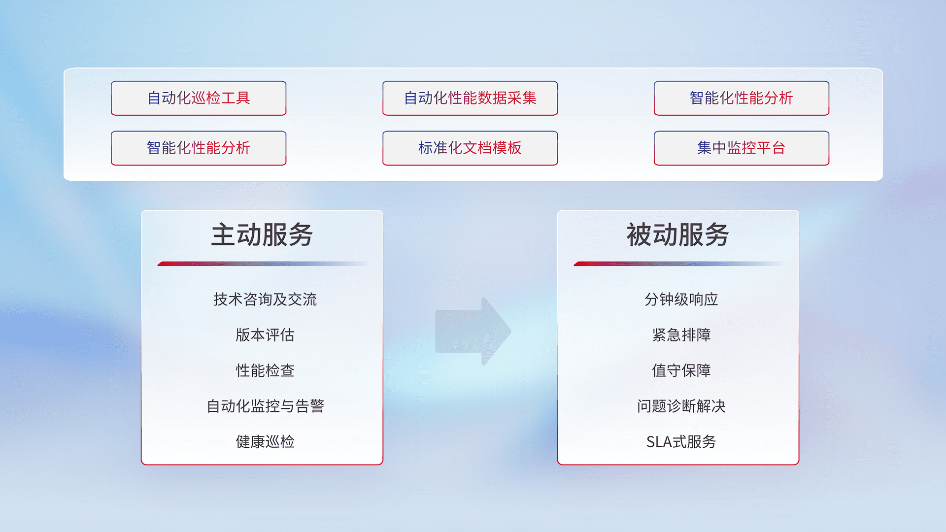 智能化工具和标准化文档,,,保障服务质量,,,,提供主动服务(包含技术咨询、、、版本评估、、、性能检查、、、、自动化监控与告警、、、、健康巡检)和被动服务包含(分钟级响应、、紧急排障、、值守保障、、、、问题诊断解决、、、SLA服务)。。。